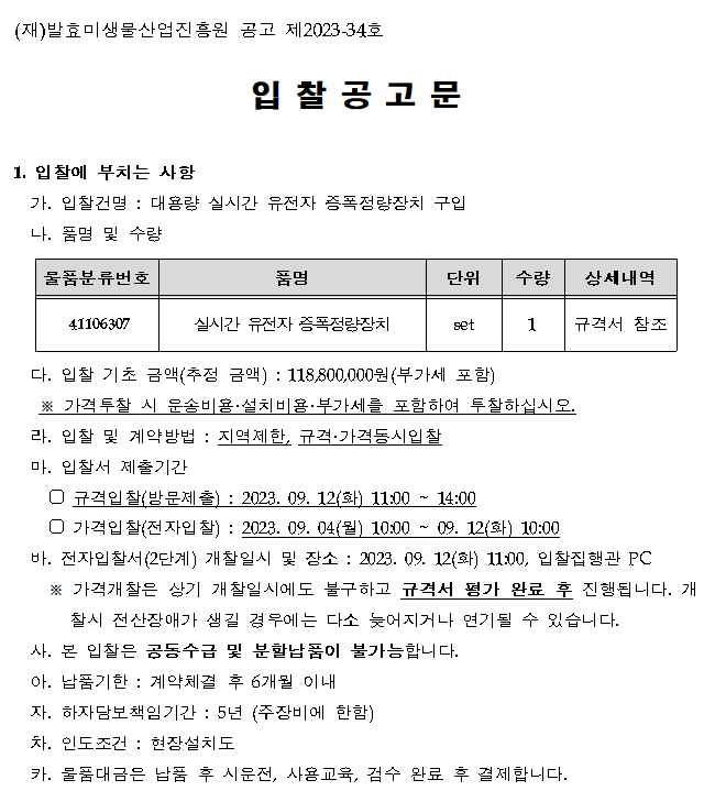 유용미생물은행구축사업 장비(실시간 유전자 증폭 정량장치) 구매 입찰 공고