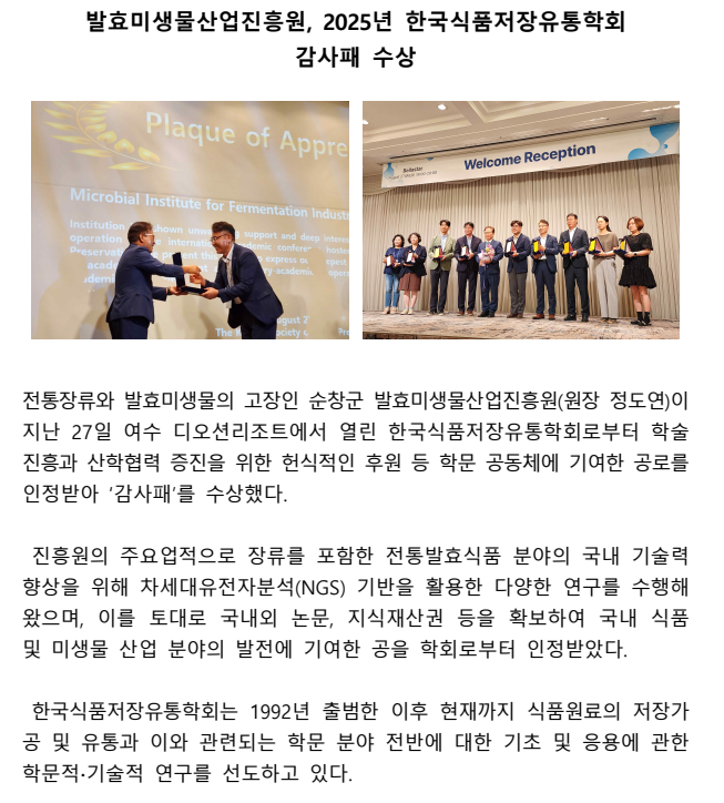 발효미생물산업진흥원, 2025년 한국식품저장유통학회 감사패 수상