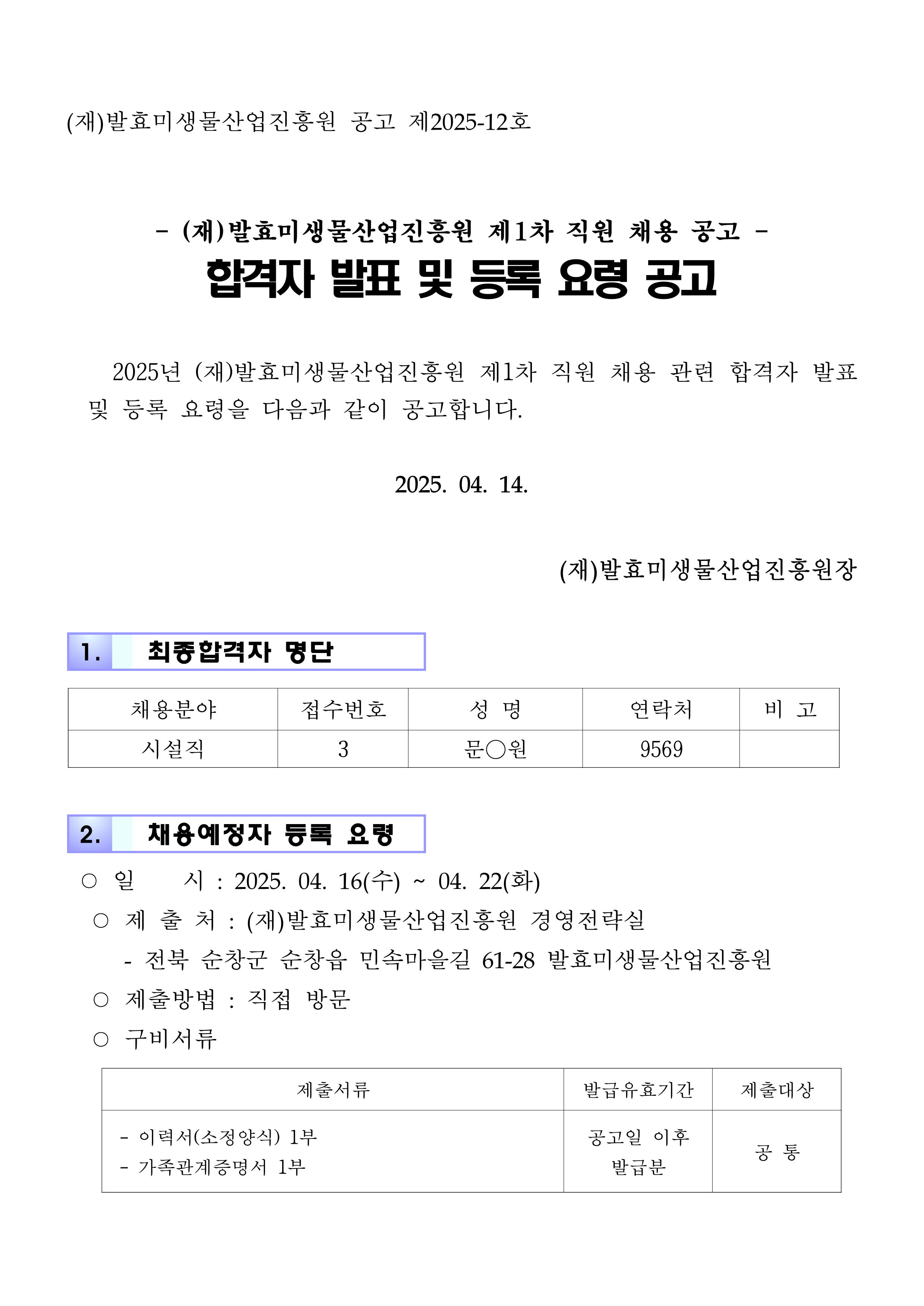 2025년 발효미생물산업진흥원 제1차 직원 채용 합격자 발표 및 등록 요령 공고