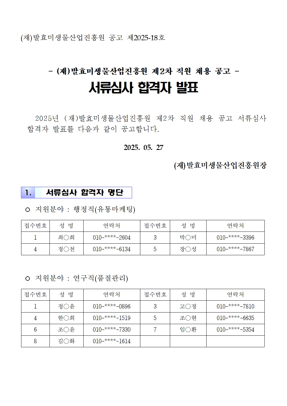 2025년 발효미생물산업진흥원 제2차 직원 채용 서류심사 합격자 발표