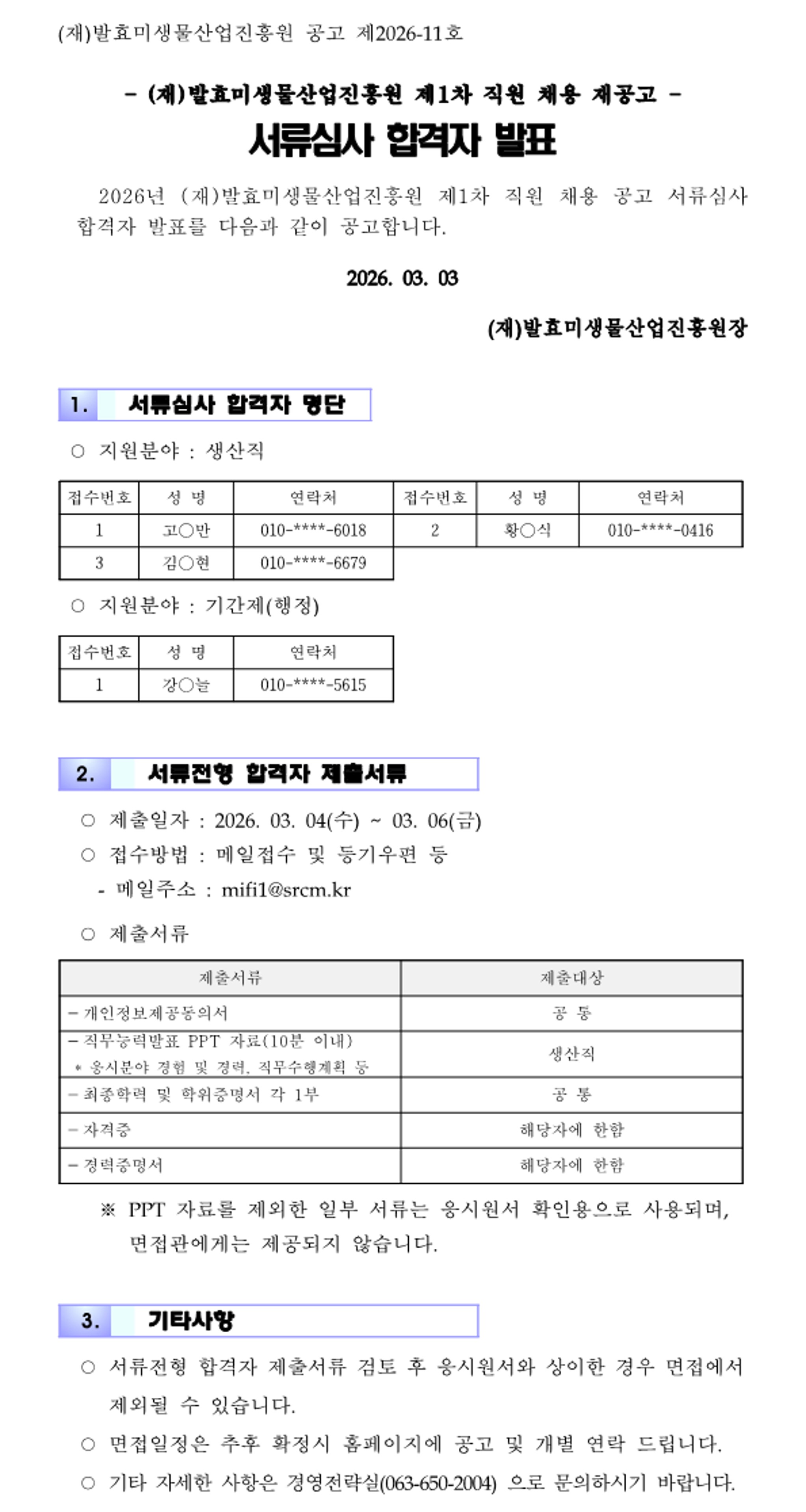 2026년 발효미생물산업진흥원 제1차 직원 채용 재공고 서류심사 합격자 발표(생산,기간제)