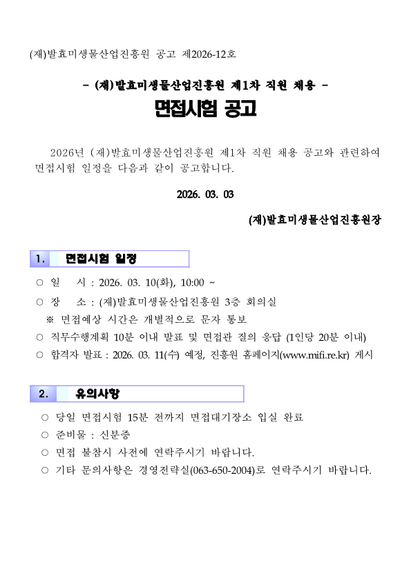 2026년 발효미생물산업진흥원 제1차 직원 채용 면접시험 일정 공고(생산, 기간제)