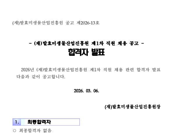 2026년 발효미생물산업진흥원 제1차 직원 채용 합격자 발표(연구행정)