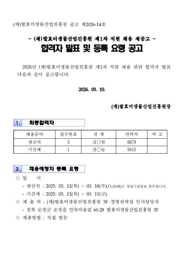 2026년 발효미생물산업진흥원 제1차 직원 채용 합격자 발표 및 등록 요령 공고(생산, 기간제)