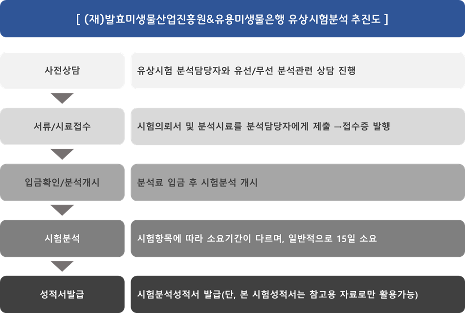 (재)발효미생물산업진흥원 및 유용미생물은행에서는 보다 전문적이고 폭넓은 기술지원을 제공하고자 유상 시험‧분석 서비스를 운영하고 있습니다.