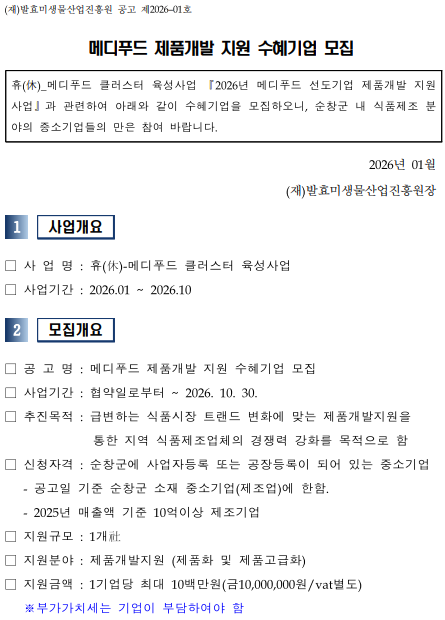(2026년 휴(休)-메디푸드 클러스터 육성사업) 메디푸드 제품개발 지원 수혜기업 모집 공고(연장_2026년02월 06일까지)