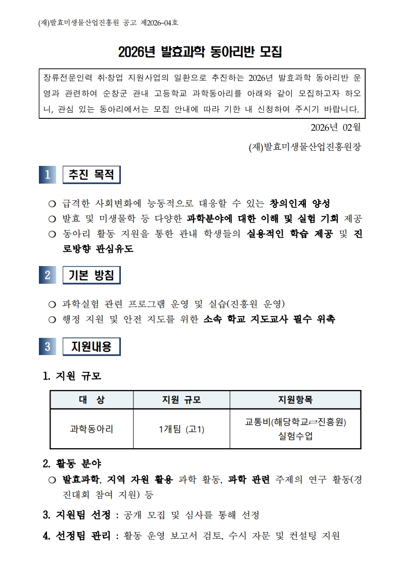 (장류 전문인력 취·창업 지원사업) 2026 발효과학 동아리반 모집 공고